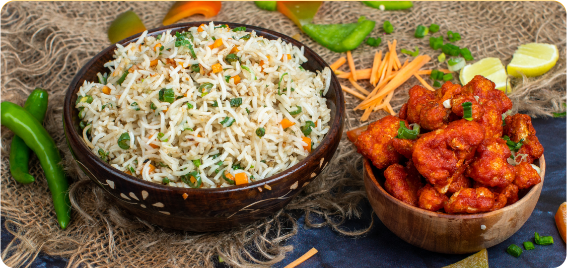 Manchurian chicken features succulent chunks of marinated and deep fried chicken, finished in a wok with a sticky, sweet and spicy sauce. The combination of savoury crispy fried chicken in a tangy sauce offers a moreish balance of flavours. In restaurants it is often served on a sizzling platter, with thick, bubbling sweet and sour sauce. The sauce is typically made using soy sauce, rice vinegar, tomato paste, chilli powder and sugar. Dry chicken Manchurian is normally served as a snack or appetiser with a dipping sauce, however, mains dishes tend to come with Manchurian-style gravy. It is a popular Hakka dish and, similar to chilli chicken and crispy beef, it is made with boneless chicken pieces. Creating the perfect Manchurian Chicken involves several steps, from cutting, marinading, coating and deep frying the chicken to mixing up a perfectly balanced sauce. It can be a bit complex to master for home cooks, however, don’t worry, we’ve done all the hard work, so you don’t have to. All you have to add is your preferred side to our Khao Chi Manchurian Fried Chicken. The dish is typically served with fried rice or Hakka noodles.